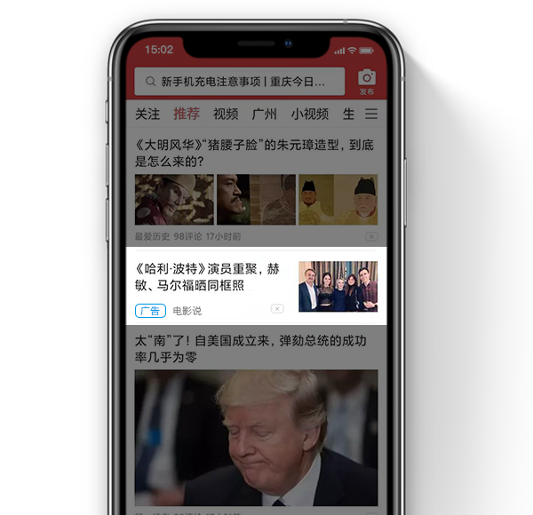 资讯流中穿插展现的原生广告形式,广告即是内容,契合资讯深度阅读体验的广告形式支持CPM、CPT、GD、CPC等多种售卖方式。